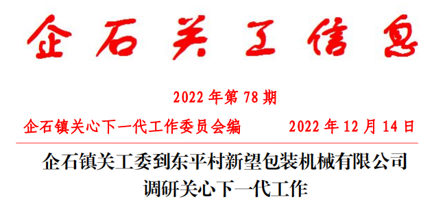 12 月 14 日上午,企石鎮關工委到東平村新望包裝機械有限公司調研關心下一代工作。企石鎮關工委主任楊煥柱,關工委副主任黃林燦、劉毅然,東平村關工委主任李堯木,公司董事長羅永輝等參加了調研活動。